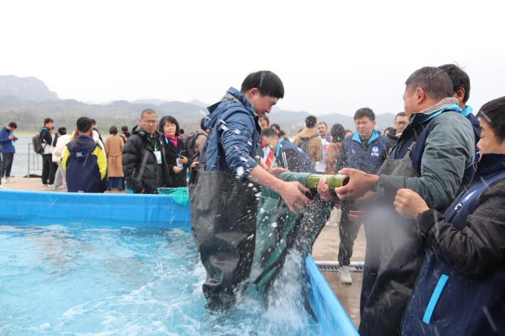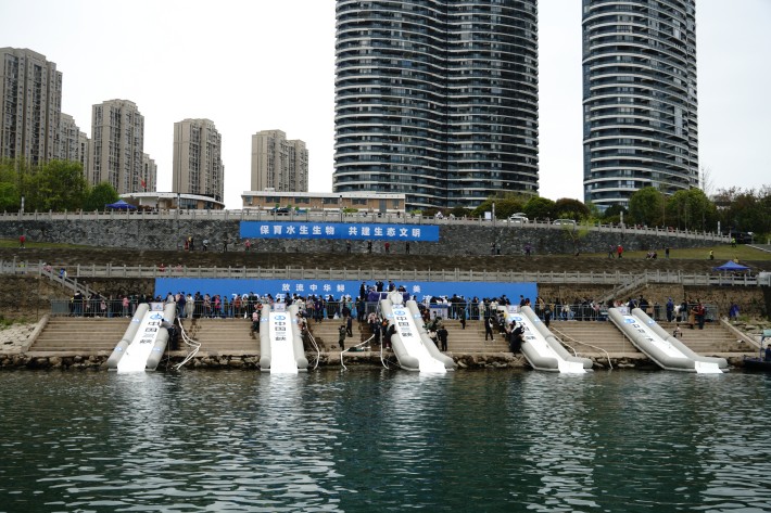 在岸边十几个大型临时鱼池中,游动着大小不一的中华鲟。据介绍,此次放流既有去年繁殖的幼鱼,也有2011年、2013年、2019年等不同年份繁殖培育的子二代个体,可实现对中华鲟野外种群数量补充和年龄结构调节。志愿者通过大鱼担架抬,小鱼用桶装的方式,将中华鲟放入放流通道。拉闸后,中华鲟随水流滑入长江,回归自然。