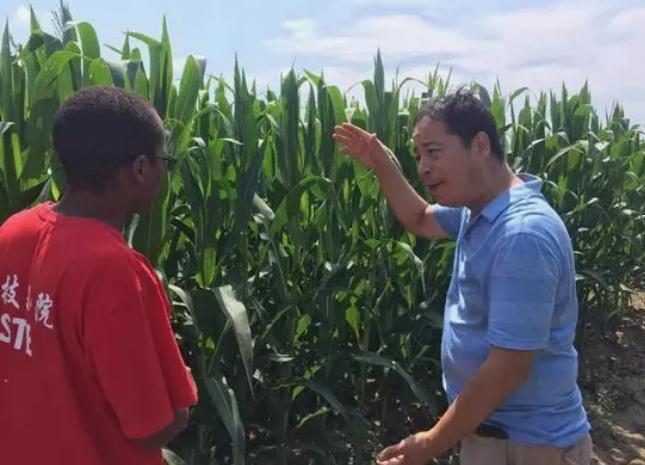 张宏彦教授在三百亩试验基地给非洲留学生阿曼尼讲解玉米高产技术。受访者供图