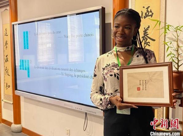 图为布基纳法索青年阿米拉展示自己拓印的作品。 中新社记者 薄雯雯 摄