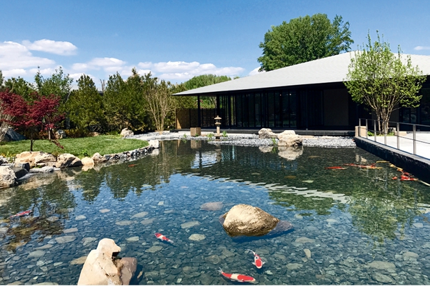 在院子中,精致的人工瀑布、沿着外墙的树木与池塘里的小鱼相映成趣,墙的内侧还种有竹子。池塘对面有一座平房,选择了接近自然的颜色,设计较为简单,设置了日式传统房子的折叠墙,可以像折扇一样折叠在一起,有利于室内的通风。在室内的展览中,有一些文字介绍了如何欣赏和制作插花艺术,插花或花道是日本文化的传统元素,这里还摆设了一些鲜花。可见,展馆的每一个元素都和谐地展示了日本家庭花园的哲学。