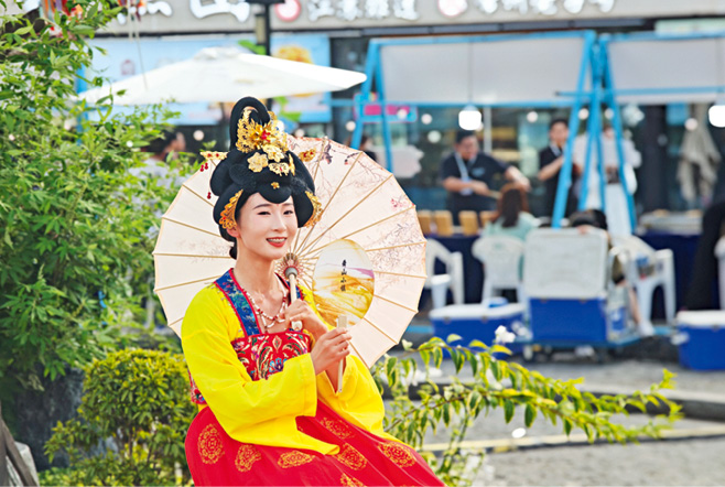 7月23日,江苏常州,台胞在2025“青春同行”两岸新媒体创享嘉年华活动现场体验传统服饰、拍摄创作 图/新华社记者 王承昊