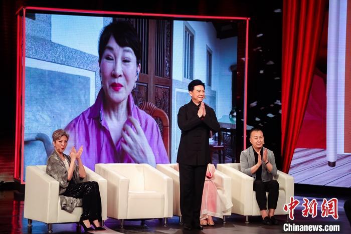 图为身在活动现场的京剧大师梅葆玖弟子、北京京剧院国家一级演员胡文阁(中)与身在台湾的同门师姐、台湾国光剧团首席主演魏海敏(投影中女士)通过视频连线叙旧对话。北京广播电视台供图