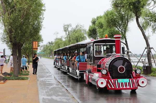 曹妃甸湿地公园多玛乐园内游客乘坐观光车游览