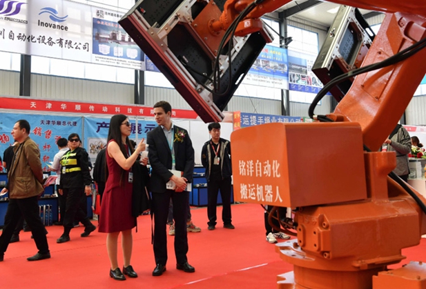 2018年4月24日,第十一届中国·东光纸箱机械国际博览会在“中国纸箱包装机械之乡”河北省东光县举行。图为西班牙驻华大使馆商务官员(身着西装者)在展厅参观