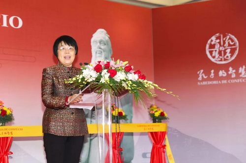 ▲ 中国外文局副局长陆彩荣主持“孔子的智慧”文化展开幕式。