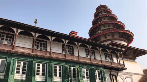 到尼泊尔,随处可见的是寺庙。杜巴广场是加德满都最有名的地方,也是观赏尼泊尔寺庙建筑的好地方,这里囊括了尼泊尔十六世纪至十九世纪之间的古迹建筑,有数量较多的寺庙和宫殿。尼泊尔大多数人信仰印度教,其余信仰佛教、基督教、伊斯兰教。这里的人们对佛教信仰的虔诚从他们的动作和眼神中可以感受到。灰色的鸽子围绕在身旁,它们与人和谐相处,成群的在自由的土地上无拘无束地觅食和飞翔,广场上随处可见那些眼神清澈见底的漂亮儿童。在广场一侧,我看到了中国援助尼泊尔广场修复项目的铜牌。