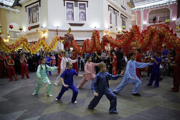 1月27—28日,俄罗斯阿穆尔州布拉戈维申斯克市城市文化中心、群岛商场、孔子学院、东方语言学院等地到处张灯结彩、舞龙舞狮,洋溢着浓郁的中国年味儿。原汁原味的山西晋城上党梆子,美轮美奂的青花瓷旗袍表演,金发碧眼的舞龙少年,中俄艺术家联袂演出的精彩节目引发现场阵阵欢呼。中俄民众在这里载歌载舞,携手联欢,共同感受着中国年的喜庆和韵味。