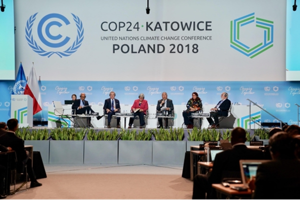 2018年12月10日,联合国卡托维兹气候大会(COP24)举行高级别会议。本届大会重点在于完成气候变化《巴黎协定》实施细则相关谈判。图为中国气候变化事务特别代表解振华(右三)在高级别会议上发言