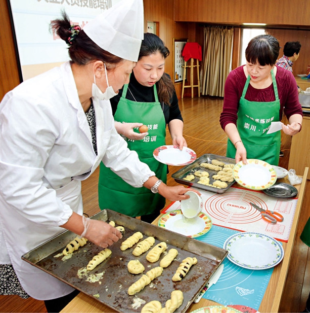 2018年4月3日,江苏省南通市观音山新城世伦桥社区失业人员和失地农民参与“面包烘焙”培训结业考试