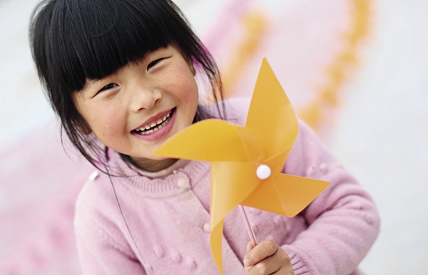 2017年4月12日,河南开封兰考东坝乡张庄小学内的风车展使得孩子们纷纷笑开颜
