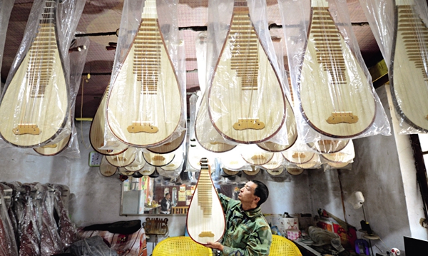 河南省兰考县堌阳镇徐场村利用本地生产桐木的资源优势,大力发展乐器制造业。村民徐会平夫妇在存放琵琶