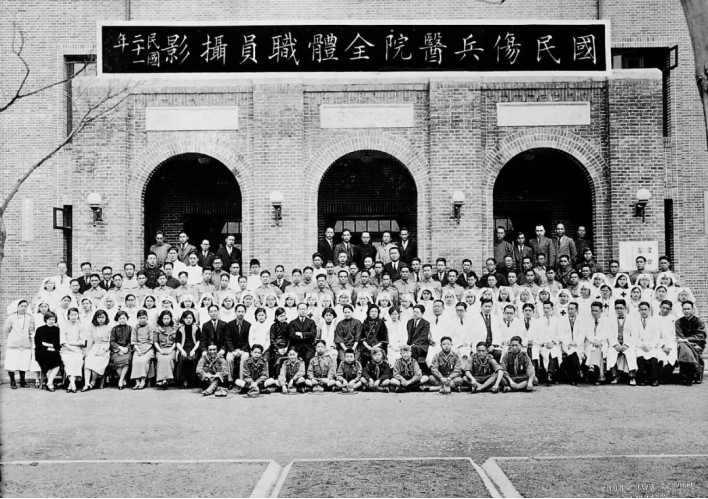 1932年3月,宋庆龄(二排左十四)在“国民伤兵医院”门前与该院全体职员合影