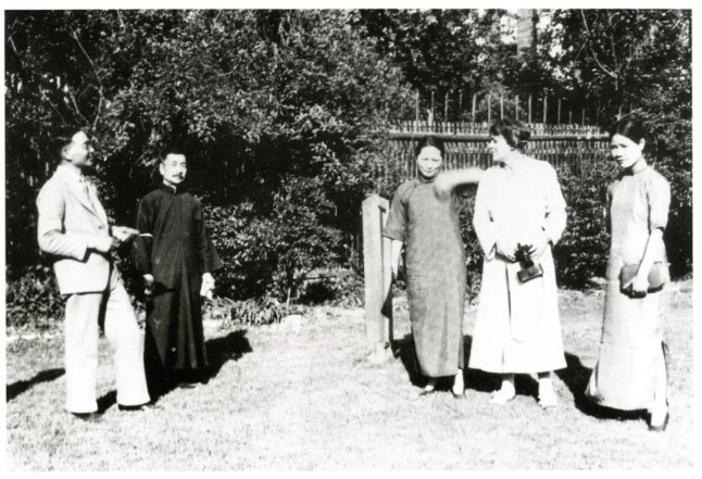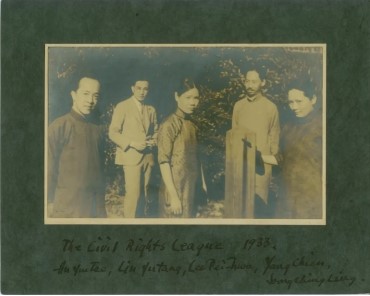 1933年,宋庆龄与中国民权保障同盟委员杨杏佛(右二)、胡愈之(左一)、林语堂(左二)及秘书黎沛华(中)合影