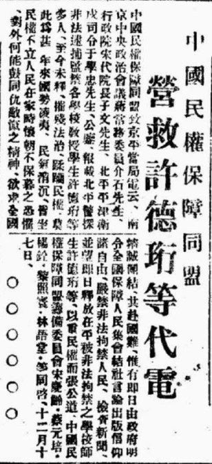 1932年12月18日,《申报》刊登的营救许德珩等代电