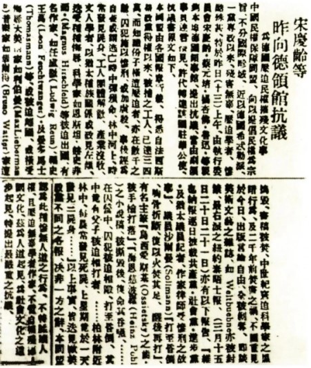 宋庆龄对德国法西斯的暴行无比愤怒。5月13日,她代表中国民权保障同盟发表《对德国迫害进步人士与犹太人民的抗议书》,并于是日上午,与蔡元培、杨杏佛、鲁迅、林语堂、史沫特莱、伊罗生一起,到德国驻沪领事馆递交了抗议书,领事馆副领事贝连表示将代转达该国驻华大使。可是,德国大使陶德曼却把抗议书直接寄还宋庆龄,拒绝转给希特勒政府,暴露了他们色厉内荏的本质。然而,他们的蛮横态度,未能削弱宋庆龄等这一举世瞩目的抗议行动所产生的深远影响。上海《申报》《中国论坛》以及中华苏维埃共和国临时中央政府机关报《红色中华》等纷纷刊登了宋庆龄的文章、《抗议书》内容,报道了宋庆龄领导的中国民权保障同盟的抗议活动。