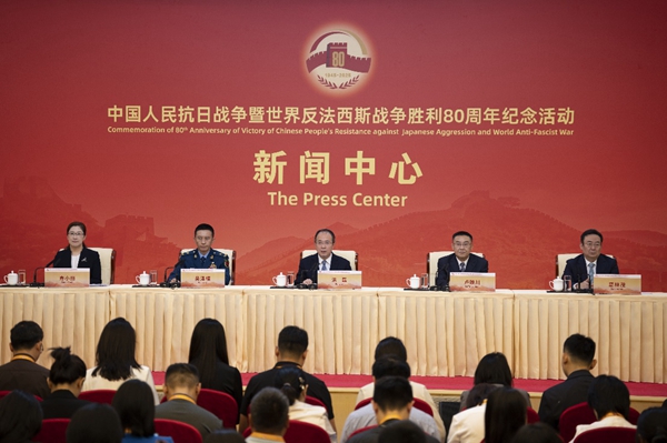 外交部部长助理洪磊,文化和旅游部副部长卢映川,阅兵领导小组办公室副主任、中央军委联合参谋部作战局少将副局长吴泽棵,北京市委常委、常务副市长夏林茂介绍中国人民抗日战争暨世界反法西斯战争胜利80周年纪念活动有关筹备进展