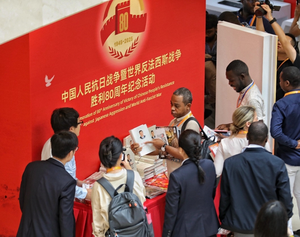 参加中国人民抗日战争暨世界反法西斯战争胜利80周年纪念活动记者招待会的中外记者现场阅读《习近平谈治国理政》第五卷