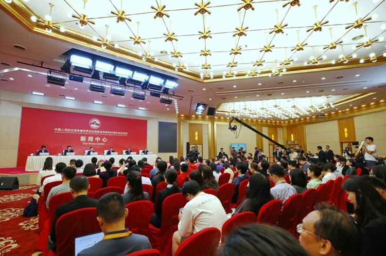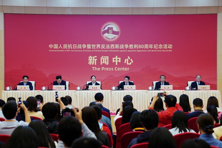 中国人民抗日战争暨世界反法西斯战争胜利80周年纪念活动第一场记者见面会在梅地亚新闻中心二层新闻发布厅举办。图/本刊记者喻捷
