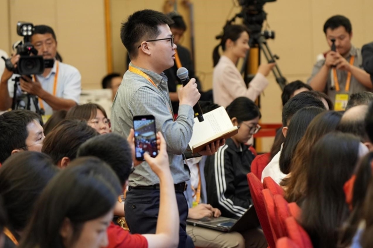 中国人民抗日战争暨世界反法西斯战争胜利80周年纪念活动第一场记者见面会上《新京报》记者提问。图/本刊记者喻捷