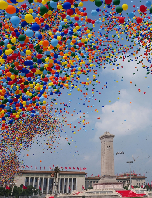 9月3日,纪念中国人民抗日战争暨世界反法西斯战争胜利80周年大会在北京隆重举行。这是纪念大会现场放飞气球及和平鸽
