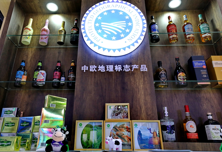 主宾国爱尔兰展台摆放着“中欧地理标志产品”认证的展品