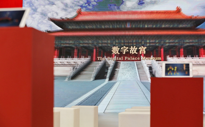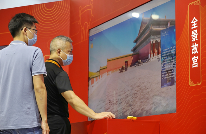 “数字故宫”体验专区,工作人员在调试全景故宫展示设备