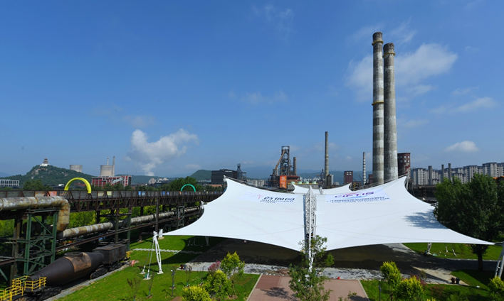 首次使用北京城市复兴新地标作为专题场馆的首钢园展区一隅,开放式展馆以装配式张拉膜结构进行搭建(服贸执委会供图)