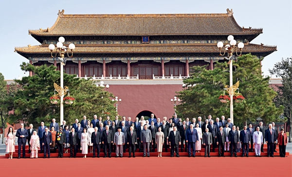 习近平和夫人彭丽媛在端门外广场迎接出席纪念中国人民抗日战争暨世界反法西斯战争胜利80周年大会的外方代表团团长及其配偶,并和他们合影留念
